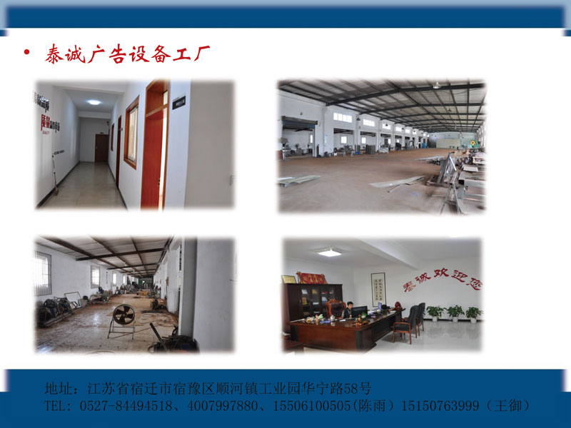 江蘇泰誠科技設備有限公司是以候車亭、景觀燈箱、閱報欄、智能垃圾箱、標識標牌、指路牌、垃圾分類亭等設計、生產(chǎn)、銷售為一體的現(xiàn)代化廣告設備公司位于宿遷市宿豫順河工業(yè)園區(qū),交通十分便捷。